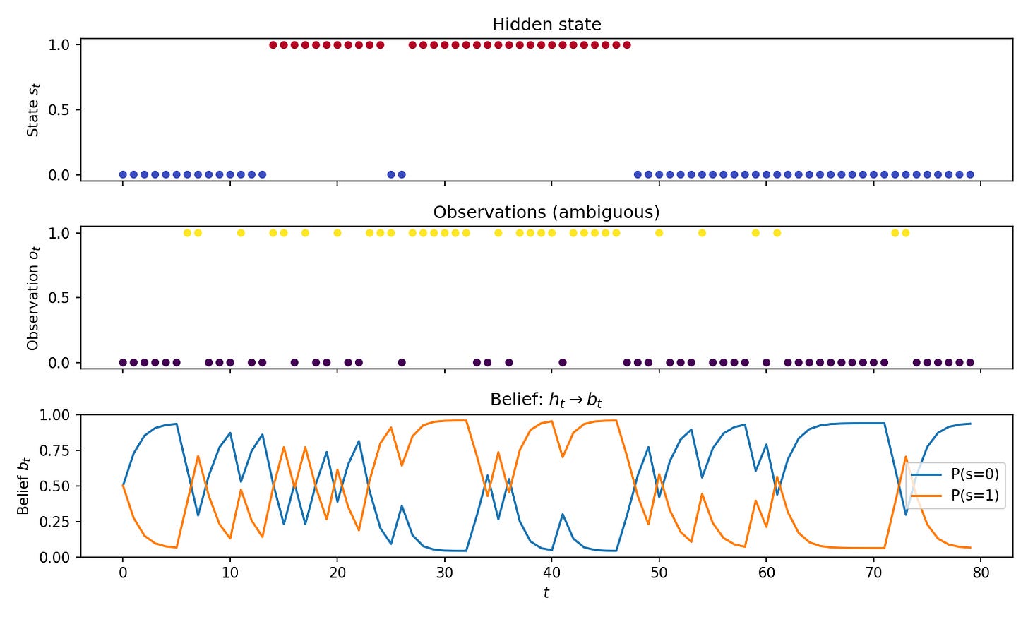 return np.array(states), np.array(obs), np.array(beliefs)The plot shows the hidden state, the observations, and the belief over time, illustrating the idea that we need a belief state as a sufficient statistic rather than raw history.
