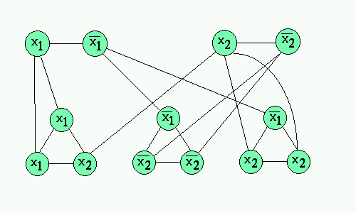 Below is a sample construction of (x1 V x1 V x2)(!x1 V !x2 V !x2)(!x1 V x2 V x2) and it's cover in the constructed graph, which will yield values of x1=FALSE and x2=TRUE: